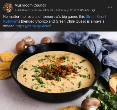 The top posts this week included a share for Blended Chorizo and Green Chile Queso from RD partner Cara Harbstreet, as well as a share of the Council’s Broiled Top Sirloin Steak with Sautéed Maitake and Shiitake Mushrooms recipe for Valentine’s Day.