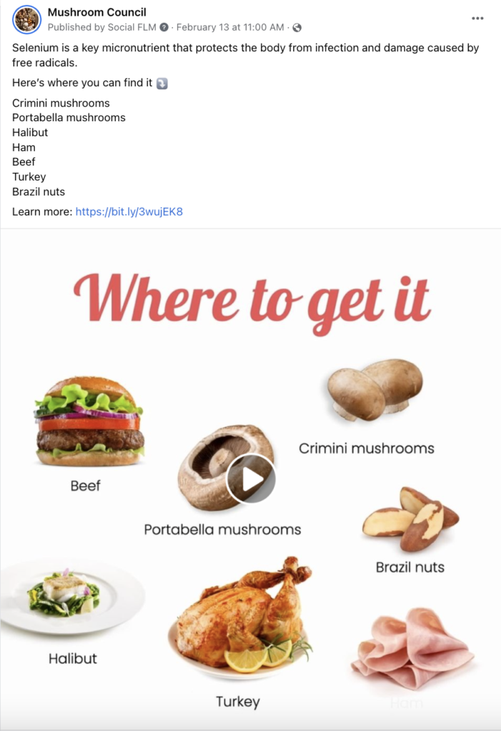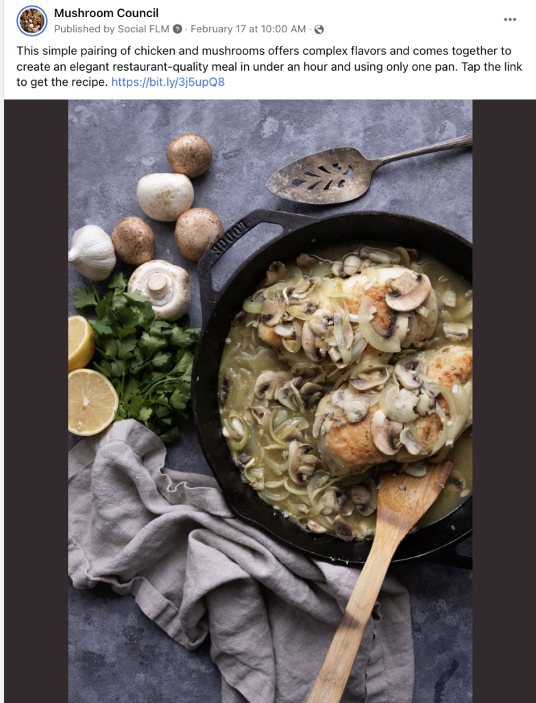 Social media fans are eager to learn more about the micronutrients mushrooms contain. A top performing post this week focused on selenium, a key micronutrient that protects the body from infection and damage caused by free radicals. Additionally, one of the FYIS “Dynamic Duos” (Chicken + Mushrooms) sparked dozens of responses and thousands of engagements. Find the recipe here.