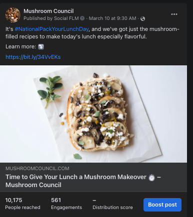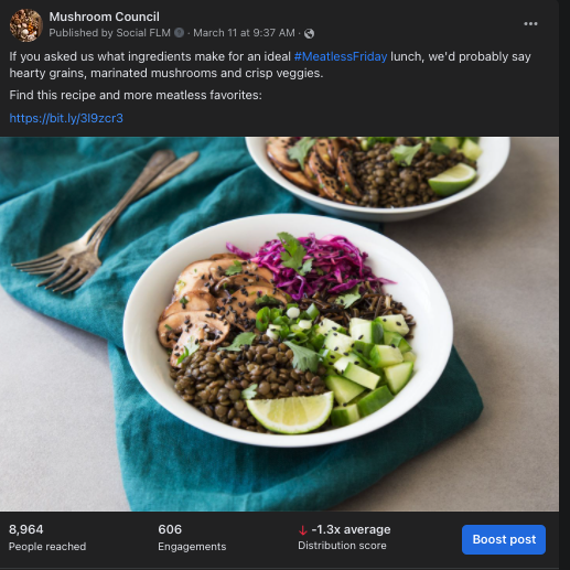 This week’s Top Posts included a link to an article encouraging mushrooms in your packed lunch, as well as a timely #MeatlessFriday post promoting our meatless recipes.