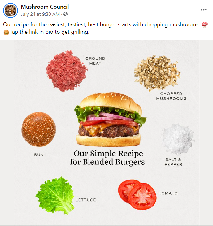 Summer grilling continues to be top of mind for consumers so this week’s top post features our simple recipe for blended burgers. The post also includes a call to action to visit the Mushroom Council’s website for more grilling tips and recipes.