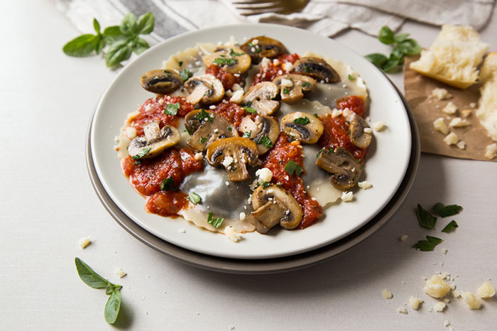 This ravioli is stuffed with a savory blend of mushrooms and herbs. Wonton wrappers make a simple substitute for fresh pasta, but feel free to use fresh pasta dough from the store or make your own. The final dish is served with a simple, rich tomato sauce and more sautéed mushrooms.