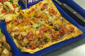 This veggie flatbread will win over any student – tons of flavor and nutrition in a familiar and kid-friendly package! The flat bread is loaded with seasoned peppers, onions, mushrooms, olives, tomatoes, and mozzarella cheese.