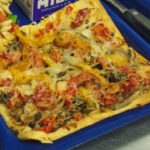 This veggie flatbread will win over any student – tons of flavor and nutrition in a familiar and kid-friendly package! The flat bread is loaded with seasoned peppers, onions, mushrooms, olives, tomatoes, and mozzarella cheese.