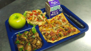 This veggie flatbread will win over any student – tons of flavor and nutrition in a familiar and kid-friendly package! The flat bread is loaded with seasoned peppers, onions, mushrooms, olives, tomatoes, and mozzarella cheese.